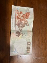 Banconota italiana da 100.000 lire con ritratto di Caravaggio (Michelangelo Merisi), emessa dalla Banca d’Italia negli anni ’90.