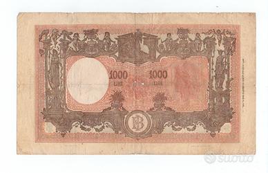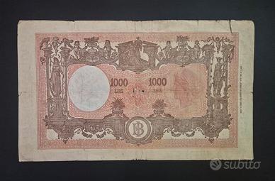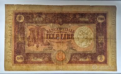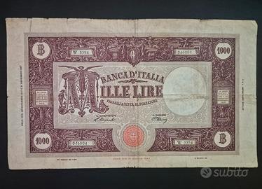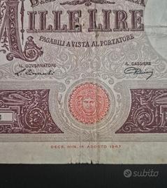 "La prima banconota emessa con un decreto Repubblicano disegnata ed incisa dal celebre artista Rinaldo Barbetti" 1.000 Lire Grande M (Sigillo Medusa) 22 novembre 1947 Firme: EINAUDI-URBINI **Banconota vissuta con diverse pieghe orizzontali e a croce,sporco raccolto e fori al centro banconota; diversi strappetti lato alto banconota 20mm, 12mm, 7mm e 5mm, strappetto lato dx 8mm; diverse discontinuità e pezzetti di carta mancante