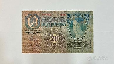 Banconota autentica da 20 Kronen (Zwanzig / Húsz Korona) emessa nel 1913 dalla Oesterreichisch-Ungarische Bank.