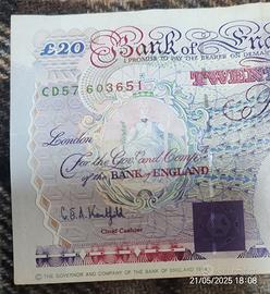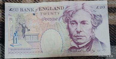 Vendo una banconota da 20 sterline inglesi, una facciata con il ritratto di Michael Faraday e l'altra con quello della Regina Elisabetta II. In buone condizioni, ben conservata. - Banconota del 1993.