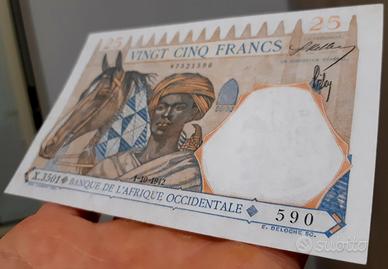 Banconota 25 Franchi dell'Africa Occidentale con decreto del 01/10/1942 serie X.3501 numero 590 in condizioni SPL.