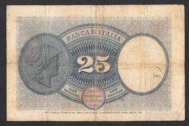 Banconota 25 lire del 1918, rara, restaurata, in conservazione come da foto. non spedisco . solo ritiro a mano.