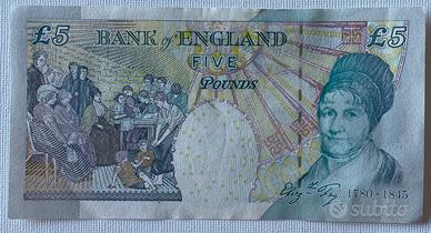 Vendo banconota inglese da £5 (Five Pounds), cartacea, raffigurante la Regina Elisabetta II.