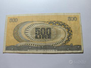 La banconota mostrata è un Biglietto di Stato da 500 Lire della Repubblica Italiana, noto come tipo "Aretusa"