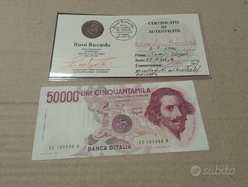 Da collezione privata vendo banconota 50000 lire primo tipo decreto raro in condizioni di conservazione BB+ così come da perizia allegata.