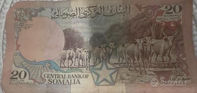 vendo una banconota da 20 Shilin Soomaali / 20 Shillings, emessa dalla Banca Centrale della Somalia (Bankiga Dhexe ee Soomaaliya) nell'anno 1989. La banconota è identificata nel catalogo numismatico come Pick n. 33d. Sul fronte è raffigurato l'edificio della Banca Centrale, mentre il retro mostra un'immagine di bovini.