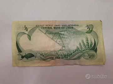 Rara e affascinante banconota da Mezzo Dinaro (1/2 Dinar) proveniente dalla Libia, risalente all'era della "Grande Giamahiria Araba Libica Popolare Socialista".