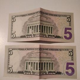 Vendo due banconote da 5 dollari rimaste dopo un viaggio in USA. Le banconote a parte la piega centrale, sono perfette. Le vendo entrambe a 10 euro, ottime per chi vuole conservarle per collezionismo Ritiro a mano a Legnano , NON spedisco