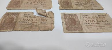6 banconote da 1 lira del 1944 Diverse gualcite e molto usurate Condizioni discrete Accetto anche offerte