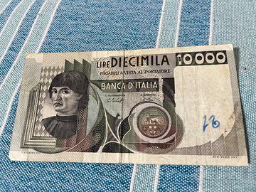 10.000 Lire in cui sul dritto è rappresentato il dipinto di Andrea del Castagno, Ritratto di uomo a mezzo busto, mentre sul verso è raffigurata parte dell'entrata della chiesa del Gesù Nuovo a Napoli, accompagnata da pietre bugnate a diamante.