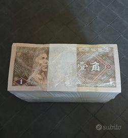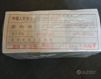 banconote nazione Cina 1000x1 jiao numeri consecutivi mai circolate condizioni fior di stampa FDS blocco da 10 mazzette ogni mazzetta 100 pz tot 1000 banconote 140 euro tutto il lotto