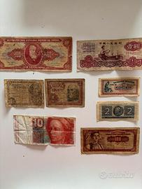 100 cruzeiros brasiliane, 2 banconote da una pesata spagnola, un yuan cinese del 1960, una drachma greca del 1941, due drachme greche del 1941, 100 dinari ex jugolslavia 1955 e 10 franchi svizzeri.