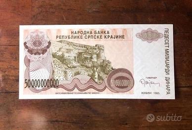 Vendo due banconote: da 50 miliardi di dinari ex Jugoslavia con relativo certificato di autentcità Bolaffi, fior di stampa, mai uscita dalla sua confezione, e da 10.000 marchi tedeschi 1922 chiedo 20 euro, potete vederle ad Ostia, (stazione Lido Nord), non spedisco in nessun caso, per cortesia contattatemi su Whatsapp: 3406219048 date un'occhiata anche agli altri miei annunci, se prendete più cose posso fare uno sconto.