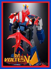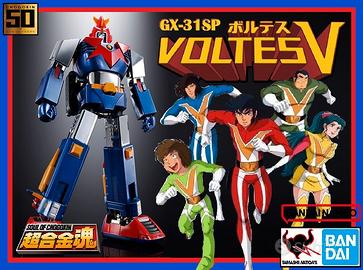 VOLTE DELLA MACCHINA GX-31SP CHODENJI ? CHOGOKIN 50th Ver., dal classico anime "Super Electromagnetic Machine Voltes V", si unisce a SOUL OF CHOGOKIN! Questa rappresentazione del super robot presenta accenti cromati argentati per onorare il cinquantesimo anniversario del personaggio classico! Anche l'attacco della nave falco è stato modificato rispetto alla versione precedente del GX-31V.