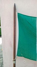 vome da foto bandiera italiana con scudetto dei Savoia, probabilmente anni 20 del Novecento. asta in legno originale e cordini. in buone condizioni, salvo un angolo sulla parte verde dove la tela presenta dei buchi. Si valutano proposte.