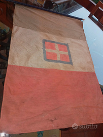 Vecchissima bandiera del regno di italia sotto la regnanza del reame della famiglia savoia da cm 90 x 56 . vista fronte e retro . fine 800 . color verde scolorito dalla vecchiaia . originale e senza strappi . compreso bastone .
