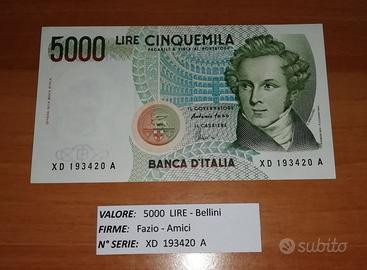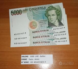 Da collezione privata vendo 7 banconote FDS da 5000 Lire - (Bellini) con le seguenti firme: - 3pz. Ciampi / Speziali (serie consecutive) - 3pz. Fazio / Amici (serie consecutive) - 1pz. Fazio / Amici (serie sostitutiva) Massima serietà, ulteriori info in privato.