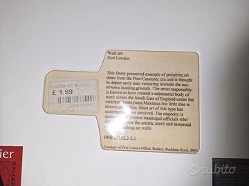 Artista: BANSKY Opera: Peckam Rock Tipologia: SCULTURA Materiale: LEGNO, stampato. Cornice: Museale con vetro invisibile, fatta su misura dal negozio Atelier della cornici di Calvenzano (BG) Misure scultura: 11.9 x 18.0 x 0.4 cm Questa edizione è autorizzata da Pest Control / Banksy ed è stata creata per il British Museum come parte della mostra iObject nel 2018. La Peckham Rock originale fu, di nascosto e provocatoriamente, esposta da Banksy nel 2005 al British Museum e lì rimase per tre giorni, prima che la direzione del Museo si accorgesse del fatto. Nel 2018 è stata nuovamente esposta nell’ambito di una mostra tematica e, in quell’occasione, furono vendute le poche cartoline in legno prodotte dell’opera. Sul retro della cartolina venne apposto il prezzo originale dell'opera (£ 1.99) come riportato sull'etichetta autentica; venduta esclusivamente nel negozio del British Museum. N.B: QUESTA ETICHETTA È GARANZIA DELL'ORIGINALITÀ DELL'OPERA, attenzione ⚠️ alle copie false delle cartoline che circolano in rete. Sempre nel retro il testo recita: "Wall art. East London. This finely preserved example of primitive art dates from the Post-Catatonic era and is thought to depict early man venturing towards the out-of-town hunting grounds. The artist responsible is known to have created a substantial body of work across the South East of England under the moniker Banksymus Maximus but little else is know about him. Most art of this type has unfortunately not survived. The majority is destroyed by zealous municipal officials who fail to recognise the artistic merit and historical value of daubing on walls. PRB 17752,2-2,1. Courtesy of Pest Control Office, Banksy, Peckham Rock, 2005."