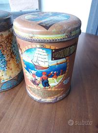 Coppia di barattoli d'epoca "Saiwa" Genova, celebre azienda di biscotti, originali, conservati ma con i segni del tempo. Gli oggetti raffigurano scene e disegni tipici dell'epoca, e si fregiano dello stemma (Real Casa). Molto decorativi, da collezione. Mis. 11cm Per info 340 6203846 o WhatsApp.