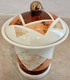 Barattolo con coperchio in pregiata ceramica decorata a mano design Marcello Innocenti. Oggetto unico di design marchiato come da foto e con cartellino e adesivo del produttore. Il barattolo ha altezza 17 cm e diametro massimo 15 cm. Sarà accuratamente imballato e spedito.