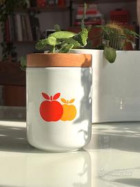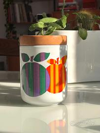 Barattolo vintage alto 15 cm, prodotto dalla Franco Pozzi di Gallarate negli anni ’60. Realizzato in ceramica con coperchio in legno, presenta una grafica colorata tipica dell’epoca con disegno di mele. Perfette condizioni, un pezzo autentico dal fascino retrò, ideale per collezionisti o come elemento decorativo originale.