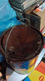 Barattolo in latta di grasso IP ( dovrebbe essere da 5 kg ma non c'è scritto). Il barattolo è vissuto e il coperchio ha molta ruggine e si incomincia a rompere. È comunque un bel barattolo in latta vintage da collezione.