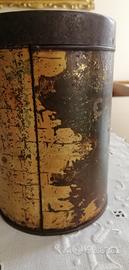 La scatola, priva di ammaccature, presenta segni evidenti di usura e ruggine sul fondo, tipici di un oggetto degli anni '40 utilizzato in cucina. La nonna ci riponeva l orzo tostato per i caffè.