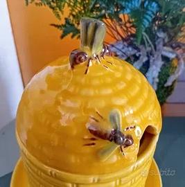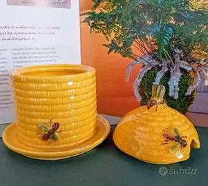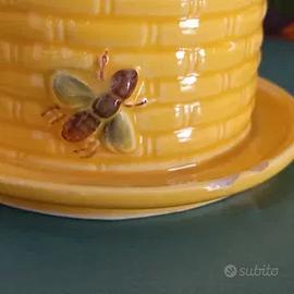Marchio anni 50 /60. Contenitore per miele. decorato a mano con arnia e api in rilievo . Condizioni vintage molto buone. Il prezzo tiene conto delle piccole sbeccature visibili in foto. Altezza cm 11 orlo cm 8 .l