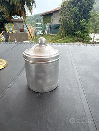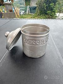 Vendo originale barattolo vintage in alluminio con scritta in rilievo “ZUCCHERO”, perfetto per amanti dello stile rétro, collezionisti o per arredamento shabby/industriale. 🔸 Materiale: alluminio 🔸 Epoca: presumibilmente metà ‘900 🔸 Condizioni: buone, con normale patina del tempo (vedi foto) 🔸 Coperchio originale con pomello 🔸 Scritta in rilievo ben visibile e molto decorativa 💡 Ideale per: •arredare cucine vintage o rustiche •allestimenti di bar, agriturismi o locali •collezionisti di oggetti da cucina d’epoca ✨ Oggetto autentico, non riproduzione!