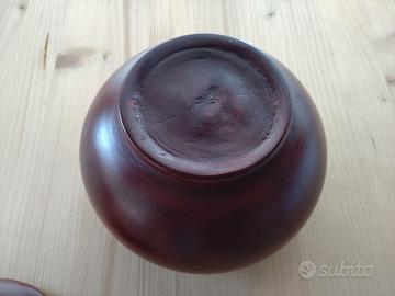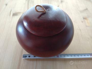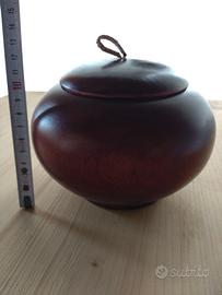 Barattolo vintage vietnamita in legno di sandalo anni '50, dal caratteristico profumo naturale inconfondibile (ma si sente particolarmente aprendo la scatola che non da fuori). In ottime condizioni, tranne per una piccola fessura aperta su un lato del coperchio, come indicato chiaramente in foto. Presumibile una produzione più recente, ma comunque si rifà alla tradizione artigianale tipica del Vietnam degli anni '50. Con coperchio con manico in fibra di bambù, il legno cambia colore, passando da quasi nero a un colore simile al mogano a seconda delle diverse condizioni di luce. Misure di riferimento in foto. Le foto descrivono esattamente il barattolo e sono parte integrante della descrizione. Visita il mio profilo per altri oggetti etnici e non solo.