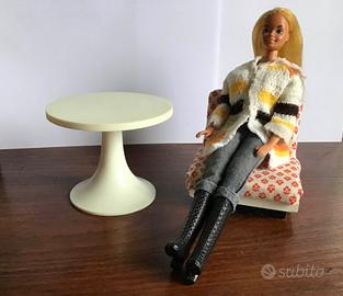 Barbie Accessori anni ’70: poltrona in legno bianco /nero con cuscini imbottiti decorati con margherite rosse + tavolo rotondo in plastica. Seventies style ! #barbie #accessories #seventies #anni70 #vintage