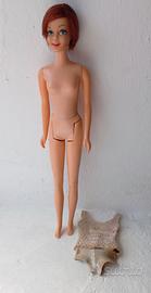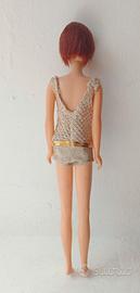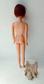 Barbie Casey TNT #1180, capelli rossi, 1967 Sul retro è impresso: c 1966 Mattel INC U.S. PATENDED U.S. PAT PEND MADE IN JAPAN -La parte superiore del costume da bagno è consumata e allungata. -Sono presenti alcune zone più chiare sulla fronte e intorno a ciascun orecchio. -Il ginocchio sinistro è stato riparato e non si piega più