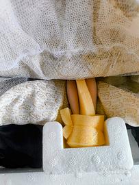 La bambola indossa un abito in velluto nero e raso avorio, impreziosito da ricami dorati e perline.