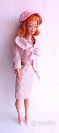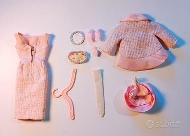 Barbie Fashion Luncheon #1656 vintage 1966 -Giacca rosa -Vestito rosa (presenta una leggera macchia nel punto in cui la parte superiore si unisce alla gonna - vedi foto) -Cappello rosa a tesa arrotolata -1 guanto bianco -1 scarpa originale, 2 scarpe di ricambio rosa -Collana di perle -Borsa a mano con perle - 1960 -Gruccia rosa -Bambola venduta separatamente