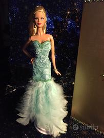Vendo Barbie ooak da collezione, pezzo unico, originale, di alta sartoria con abito, acconciatura e accessori realizzati a mano. L'abito è una sinfonia di verde acqua con il tubino in pizzo foderato in raso e strati di morbide piume a comporre la gonna. Cristalli in tinta decorano la scollatura a cuore, il bordo del tubino e brillano nell'elegante acconciatura. Orecchìni ed un braccialetto degli stessi cristalli e scarpine in tinta completano il modello. Sono inclusi piedistallo e scatola abbinata. PREZZO NON TRATTABILE. Preferibile ritiro a mano. Spese di spedizione non incluse.