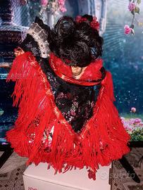 attenzione ai dettagli e al suo stile unico. Ogni elemento del suo abbigliamento e degli accessori è pensato per esaltare la bellezza e la cultura spagnola. avvolta da un lungo sciale nero pizzo con frange rosse che ricorda la terra calda di culture della Spagna.