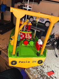 Vendo Paula 4 barca rc scala 1/25 solo montata completa di tutto, mai navigato solo prove di galleggiamento monta motore brushed regolatore brushed servo sterzo, servo gru alza abbassa, servo verricello cavo gru, cannone acqua con la sua pompa autopescante, radiocomando futaba 8 canali 2,4 ghz, con vari personaggi e accessori ritiro a mano visto le dimensioni e fragilita