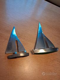 vendo particolarissimi e non comuni, 2 modelli barche a vela in alluminio, vitage, quella più grande misura lunghezza cm.20,5 altezza vela cm. 27,5. la piccola lunghezza cm.12,5 altezza cm 23. lavorazione artigianale, come da foto parte integranti della descrizione. presentano segni dovuti al tempo