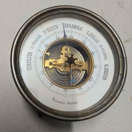 Antico barometro aneroide inizi XX secolo. Cassa circolare in metallo 10cm, spessore 5cm. Provvisto di piedini ed anello. Ottima patina di antichità