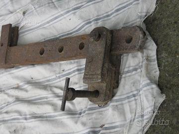 barra di traino attacco attrezzi per trattore, costruita con ferro a sezione rettangolare cm.8x2,5 lunghezza totale cm.194 con 11 fori diametro mm.25 per fissaggio blocco spostabile, completo di due perni di attacco, consente di attaccare attrezzi in modo decentrato a diverse misure rispetto al trattore, vedi disegno in foto, vendo a e.140, ritiro e trasporto a carico del compratore