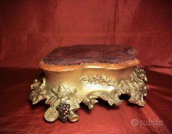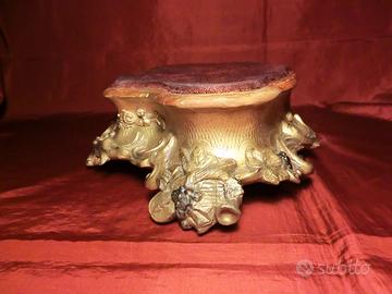 Descrizione: Elegante base espositiva in legno sagomato, caratterizzata da profilo mistilineo e ricca decorazione plastica a pastiglia lungo l’intero perimetro. La composizione ornamentale presenta un articolato repertorio decorativo di gusto eclettico: riccioli, volute fogliacee, festoni, motivi rocaille e strumenti musicali intrecciati a elementi vegetali, secondo il tipico linguaggio revivalistico del Secondo Impero. Il fascione centrale è decorato con una raffinata finitura a foglia oro, che dialoga con la modanatura superiore anch’essa dorata, creando un contrasto cromatico con la parte inferiore in pastiglia dorata a rilievo. La ricchezza plastica della decorazione evidenzia un gusto scenografico e teatrale, coerente con l’estetica napoleonica di recupero degli stili Luigi XV e Luigi XVI. La superficie superiore, destinata all’appoggio dell’opera, è rivestita in velluto rosso originale, oggi in gran parte abraso dal tempo ma ancora leggibile nella cromia e nella funzione decorativa. Il rivestimento tessile sottolineava la funzione espositiva del manufatto, contribuendo a valorizzare l’oggetto sovrastante. La base poggia su piccoli piedini integrati nella struttura sagomata.