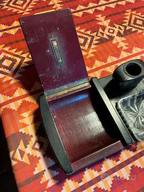 Raro porta calamaio vintage, originale anni 60 in legno laccato. Con base adatta per riporre penne e inchiostro, e con cassetto apribile per riporre la carta. Buono stato, oggetto curioso da esposizione.