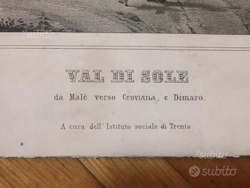 Nome: Armani Basilio Titolo: Val di Sole da Malè verso Croviana, e Dimaro Titolo: Vedute del Trentino Soggetto: Valle di Sole Luogo di edizione/stampa: München Luogo di edizione/stampa: Trento Editore/tipografo: Kuhn Editore/tipografo: Istituto sociale di Trento Anno: 1844 - 1845 Descrizione fisica: Litografia; 229x308 mm su foglio Note: Disegno e litografia di Basilio Armani; edita a cura dell'Istituto Sociale di Trento e stampata a Monaco da J. B. Kuhn; data di pubblicazione da Basilio Armani, 1817-1899, Panorami dal Garda al Tirolo, Riva del Garda, Comune di Riva del Garda, Museo Civico, 1999, scheda 64 in buone condizioni (ordinari segni d'uso e del tempo) come da foto che integra la descrizione; il foglio originale è stato ritagliato ai lati Descrizione: Ampia veduta raffigurante la Val di Sole comprendente i paesi di Croviana e Dimaro. nessuna cornice; prezzo trattabile