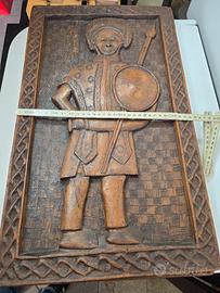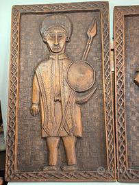 pannelli in legno intagliato a bassorilievo anni 70 che raffigurano guerrieri africani con lancia e scudo. Questo tipo di scultura rientra nell'ambito dell'arte tribale africana raffigurano guerrieri Masai e provengono da paesi come il Kenya