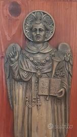 San Vincenzo Ferrer, bassorilievo religioso, arte sacra, oggetto devozionale, quadro sacro, rilievo in metallo, bronzo, icona religiosa, santo domenicano, apocalisse, giudizio universale, antiquariato religioso, collezionismo religioso, arredo sacro, targa in legno, cornice antica.