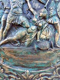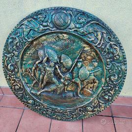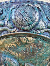 Un elegante bassorilievo decorativo ispirato alla tradizione romana, raffigurante una scena storica con guerrieri e figure mitologiche. Al centro spicca lo scudo con la famosa sigla SPQR , simbolo di Roma e del suo potere eterno. Realizzato in resina con polvere di bronzo , presenta una finitura antica con patina verde in stile archeologico, che dona profondità e carattere. Il pezzo è pronto da appendere grazie al sistema di fissaggio posteriore già installato. DETTAGLI TECNICI: Materiale: resina + polvere di bronzo Diametro: 50 cm Colore/Finitura: Bronzo anticato con patina verde Sistema di fissaggio: Gancio posteriore incluso