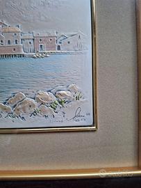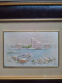 Bassorilievo di Gualtiero Casaleni in argento 925, 1986, raffigurante un paesaggio marittimo. Inclusa cornice di pregio. Misure: cornice 43,5x36,5 cm; immagine interna 18,5x11,7 cm.