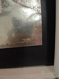 bassorilievo ricoperto in argento a fusione galvanica applicato su pannello in legno.