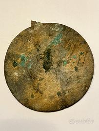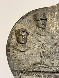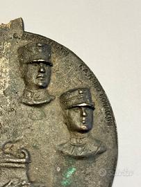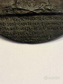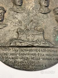 "La Patria saluta con dolore e con orgoglio i figli che sono caduti per essa innalzandola ancora una volta nella divina luce.." Bassorilievo in bronzo, diametro mm. 130. Testimonianza del primo dopoguerra italiano (1922-1925). Un'epoca caratterizzata dal culto della memoria dei caduti e dalla celebrazione del sacrificio patriottico della Grande Guerra. Al centro, in basso, campeggia un altare o un'ara votiva ornata con lo scudo sabaudo e rami di quercia o alloro, simboli di gloria e onore. Sopra di essa arde una fiamma perenne, segno del ricordo che non si spegne. Attorno alla fiamma sono disposti quattro ritratti in busto di soldati italiani, raffigurati con le loro uniformi e i caratteristici copricapi dell'epoca (il berretto floscio o la bustina). I nomi incisi sopra di loro permettono di identificare i commemorati: G. Enrico Tellini (probabilmente il Generale Enrico Tellini, il cui assassinio nel 1923 scateno l'eccidio di Corfü), Luigi Corti, Mario Bonaccini, Avv. Ruggero [Cognome poco leggibile]. Piccola mancanza dell'attaccaglia fusa insieme alla medaglia.