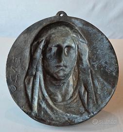 Bassorilievo tondo raffigurante Madonna Dolente, realizzato in bronzo patinato, con intensa resa espressiva del volto e panneggio profondo di gusto classico. Presente firma incisa sul bordo. Oggetto di arte sacra e decorazione da parete, produzione verosimilmente prima metà del Novecento.